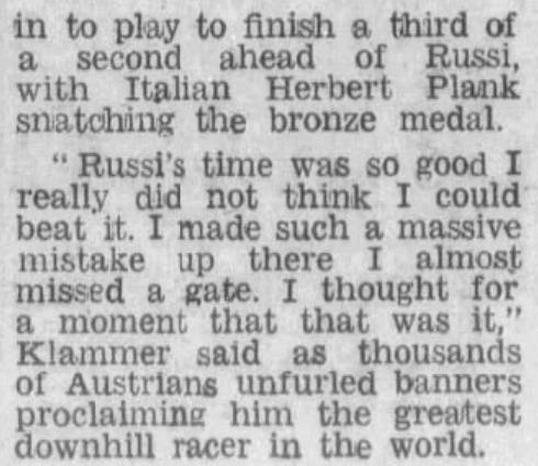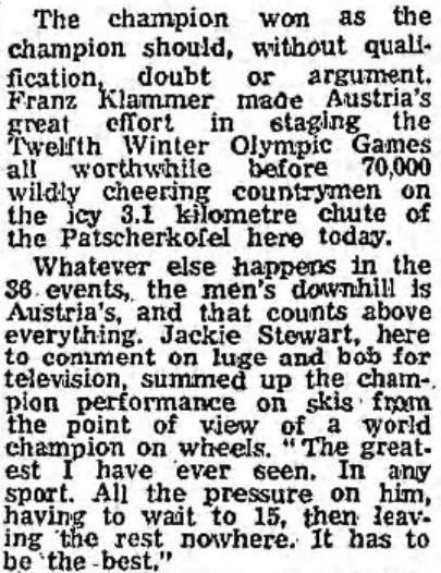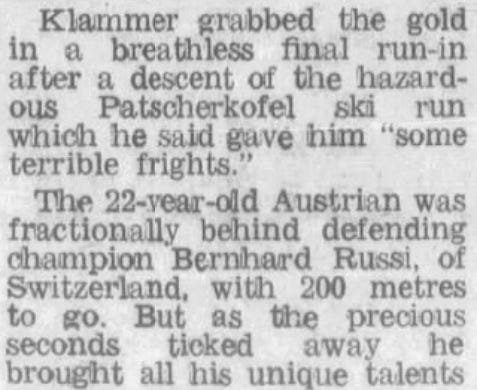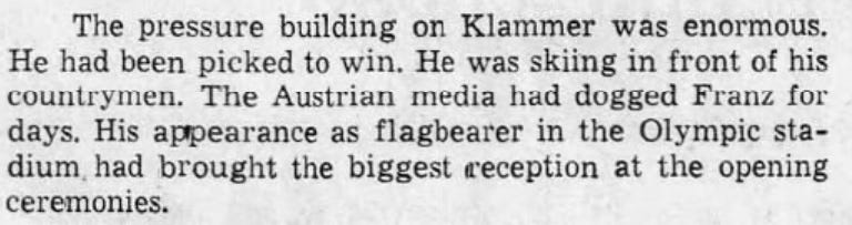 Ernie Roberts, writing in the Boston Globe, described the weight that was on Franz Klammer’s shoulders to win for the host nation, Austria: