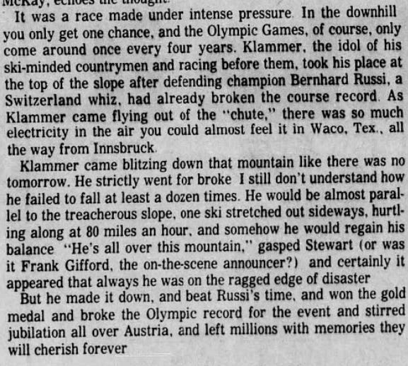 So stirring was Klammer’s downhill victory that even in the heart of Texas, where skiing does not make the list of the 20 most popular sports, Dave Campbell, sports editor of the Waco Tribune-Herald was inspired to write the paragraphs below.